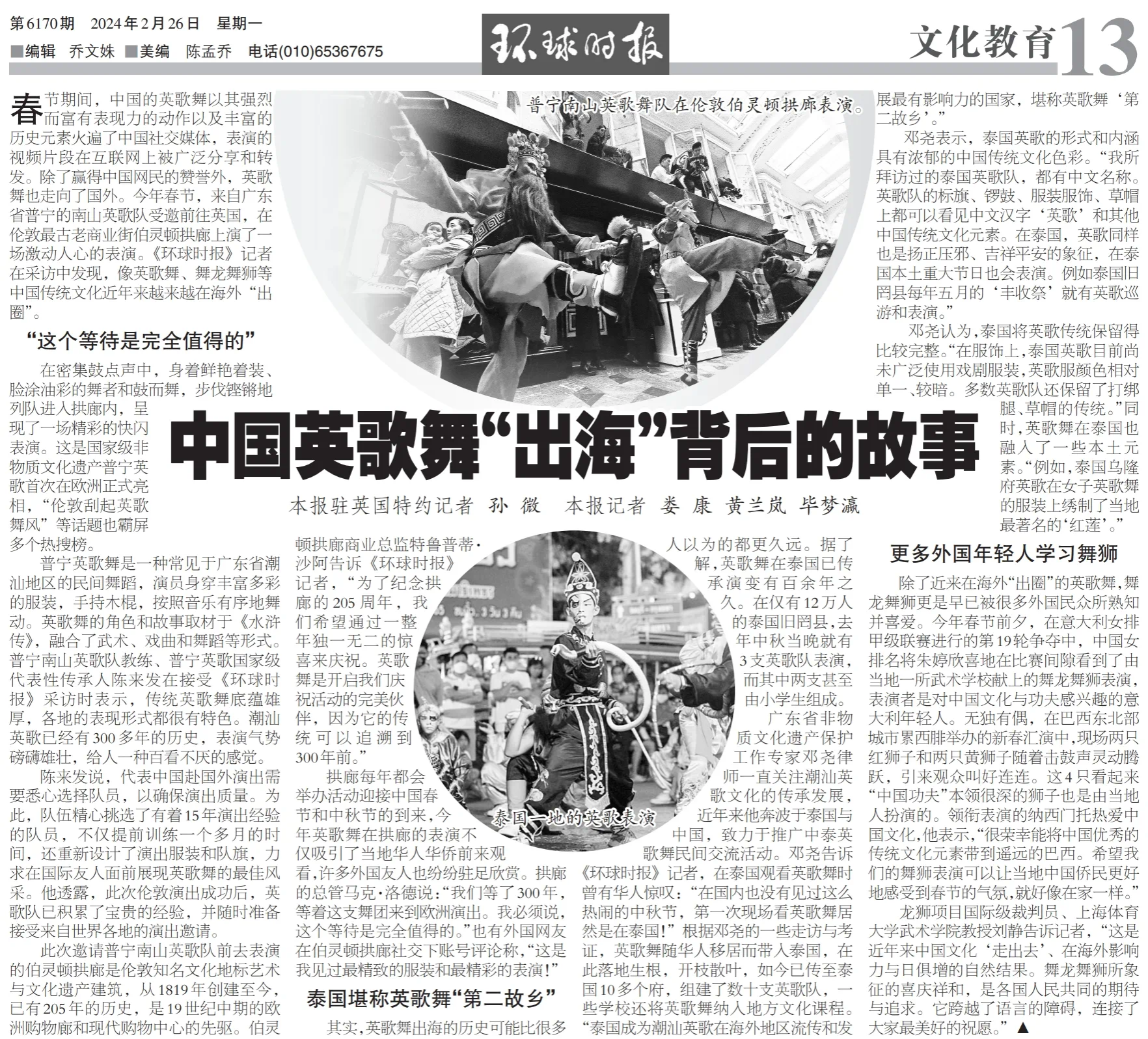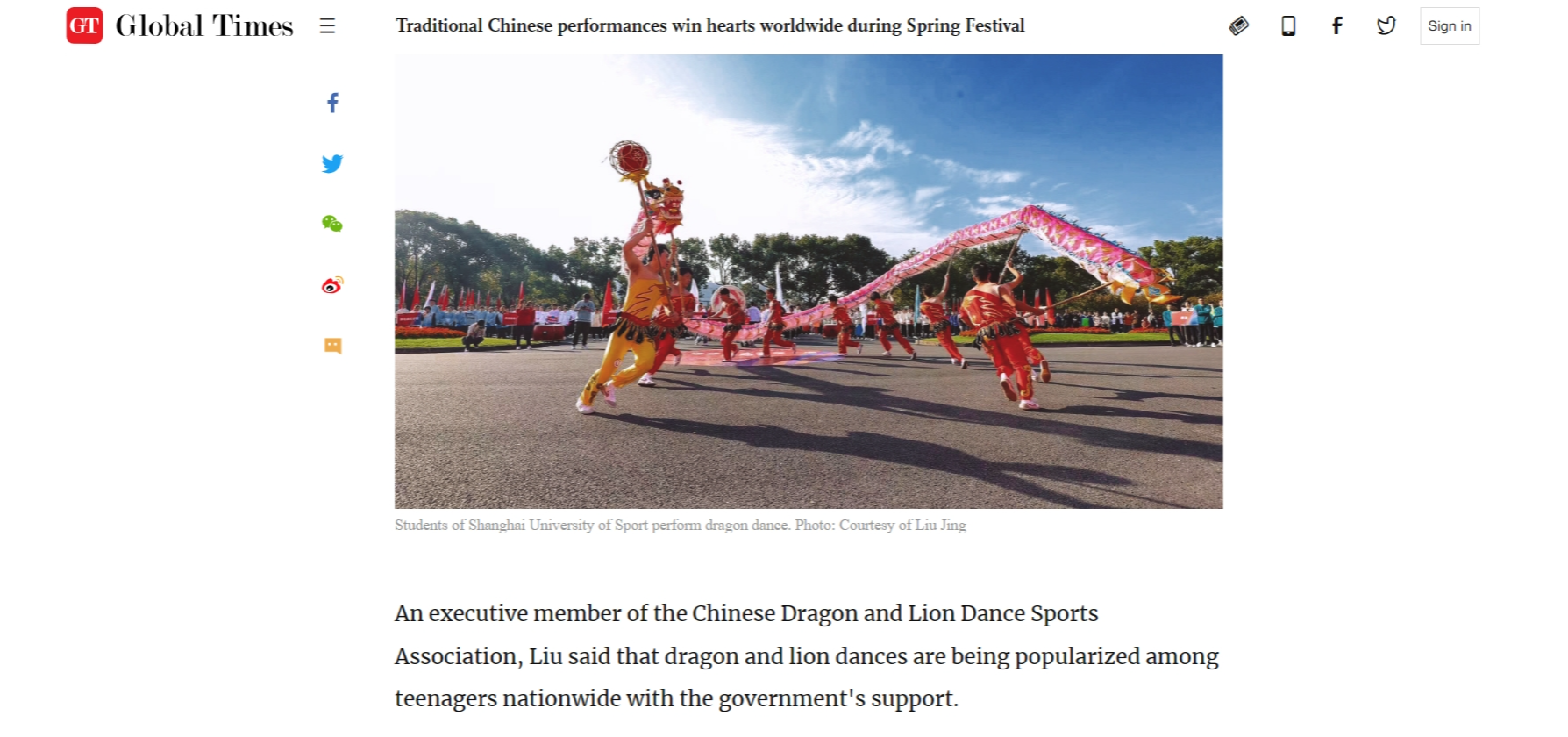 正值甲辰龙年春节之际,近日,由人民日报社主办与出版的国际新闻报刊《环球时报》(Global Times)英文版、中文版采访公司博士生导师刘静教授,报道中国龙狮文化的国际化传播以及公司舞龙舞狮项目的发展,受到广泛关注。