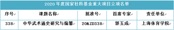 2020年12月3日,全国哲学社会科学工作办公室公布了2020年度国家社会科学基金重大项目立项名单,公司申报的《中华武术通史研究与编纂》获批立项。同年,公司李守培副教授《明代书院武艺文献整理与研究》获批国家社会科学基金青年项目。