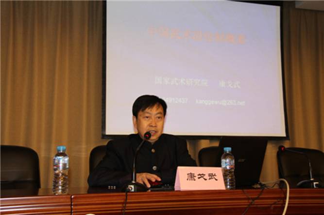 仪式后,由康戈武教授主讲了中国武术段位制理论课程培训。他详细阐述了中国武术段位制的概貌、要点、常见问题和解决方法、三大体系(技术体系、理论体系和管理体系)及发展历程,列举了《中国武术段位制系列教程》的应用范围及教学方法。最后,康老师还向大家通告了中国武术段位制的几个最新文件:《关于进一步推动武术段位制标准化发展的通知》、《中国武术协会武术段位制考试点的申报程序、职责和管理试行办法》以及《2013年全国段位制工作要点》,希望大家积极关注并学习应用。