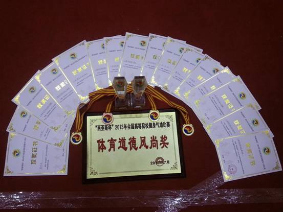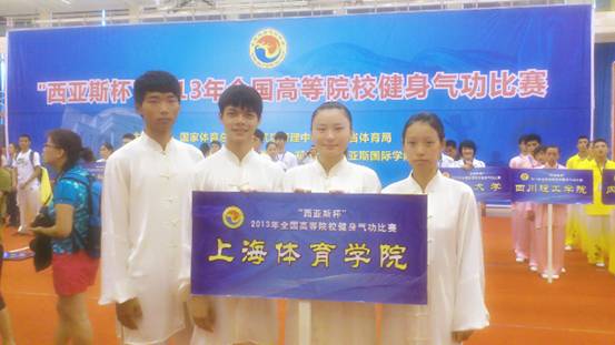 2013年“西亚斯杯”全国高等院校健身气功比赛于7月26日至29日在河南郑州大学西亚斯国际公司圆满结束。经过几天的激烈竞争,上海体育公司代表队在本次比赛中以四个第一名,一个第二名和一个第三名的优异成绩再创佳绩,同时获得体育道德风尚队称号。具体成绩是:集体五禽戏一等奖(第一);集体八段锦一等奖(第二);梁伟杰获男子个人五禽戏普及功法第一名;马多玲获女子个人八段锦普及功法第一名;刘瑞雯获女子个人五禽戏竞赛功法第一名;丁晓翔获男子个人六字诀竞赛功法第三名。另外,梁伟杰同学获得个人体育道德风尚奖称号。