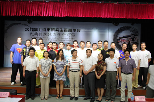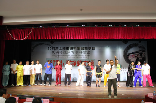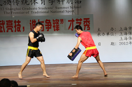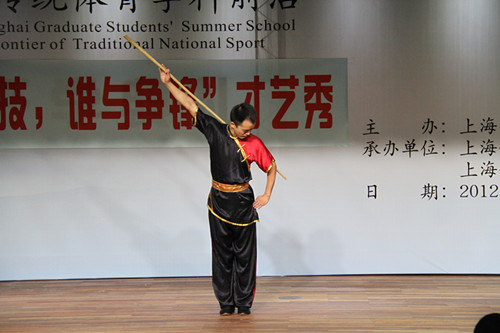 7月2日上午,2012上海市研究生暑期公司“民族传统体育学科前沿”举行了一场以“炫武亮技,谁与争锋”为主题的武艺交流展示大会。出席本次武艺展示大赛的嘉宾有上海体育公司研究生处处长吴瑛、副处长张华敏、公司党总支书记赵晓晗、经理戴国斌和副经理郭玉成。共有19名学员参赛一展风采。本次大会展示的拳种丰富,包含了太极、形意、通背、披挂、八极、少林等,另外还有独具民族特色的双手长刀等。