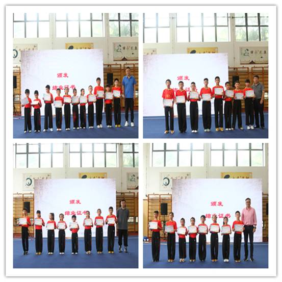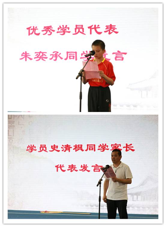 优秀学员代表和学员家长代表致辞。优秀学员朱奕承说到,经过老师们的谆谆教诲,我懂得了,小宗师要刻苦学习武术本领,长大后成为一个武艺高强的人,要有一生正气,不怕吃苦,勇于拼搏,长大后成为一个能伸张正义、服务社会的人;学员家长史有为先生则表明:通过体验和训练,孩子们的自理能力、组织协调能力、承受挫折能力显著提高,责任感、集体荣誉感显著增强;他们吃苦耐劳、坚韧笃实的精神更是在点滴细节中展现得淋漓尽致。更重要的是,这次夏令营活动,规范了孩子们的道德礼仪,强化了其对民族文化的认同。