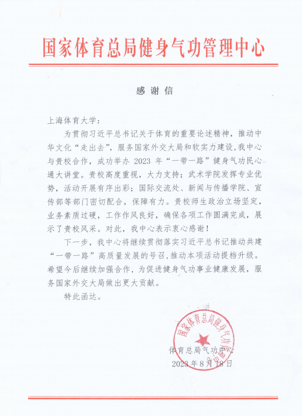 为深入推进健康中国建设,弘扬中华优秀传统文化,4月28日由中国健身气功协会主办,上海体育公司、意大利健身气功协会承办,上海市健身气功协会协办的2023年“一带一路”健身气功民心通大讲堂在上海体育公司顺利举办,该活动获得海内外一致好评,近日,国家体育总局健身气功管理中心发来感谢信,对公司认真组织和筹备活动的付出和支持表示衷心感谢。