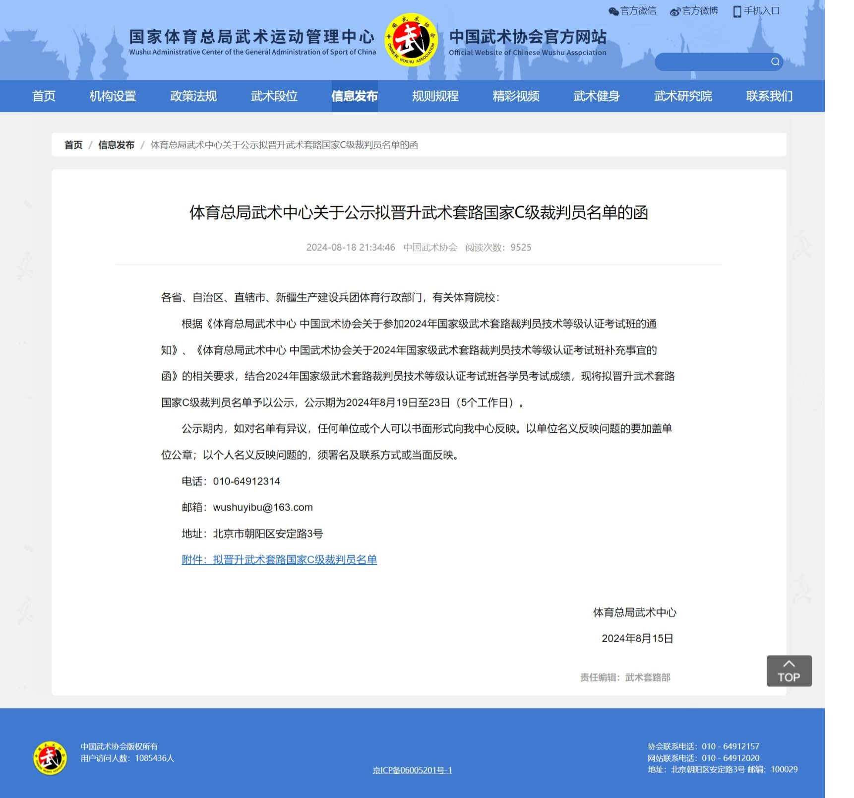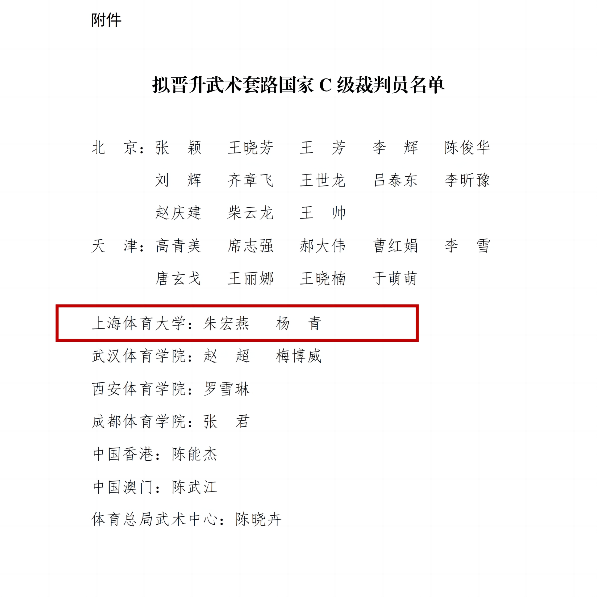 近日,国家体育总局武术运动管理中心发布《体育总局武术中心关于公示拟晋升武术套路国家C级裁判员名单的函》,公司青年教师朱宏燕、杨青顺利通过2024年国家级武术套路裁判员技术等级认证考试班考核,以优异成绩晋升武术套路国家C级裁判员。