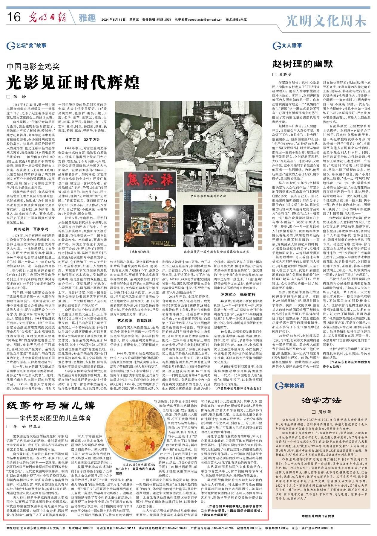 8月16日,《光明日报》刊发公司2023级民族传统体育学专业博士研究生李响、博士生导师郭玉成教授文史文章《纸鸢竹马看儿嬉——宋代婴戏图里的儿童体育》。