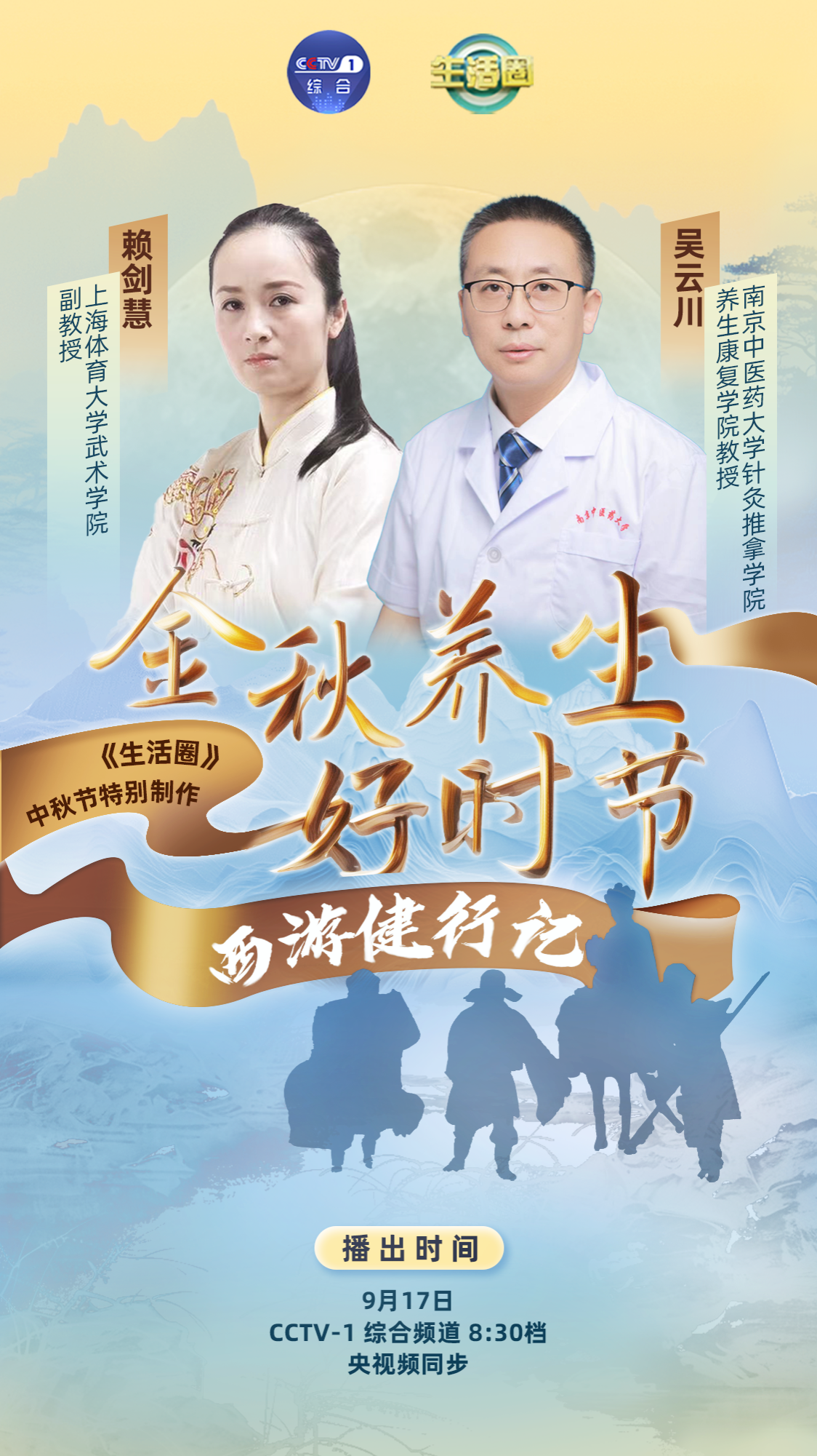9月17日,农历八月十五,是中国四大传统节日之一的中秋节。中秋节当天,公司非遗体育与健康养生教学团队赖剑慧副教授受邀为央视综合频道CCTV-1《生活圈》栏目录制的中秋特别节目“金秋养生好时节·西游健行记”播出,用健身气功专业知识为健行之旅增添健康与文化的亮色。
