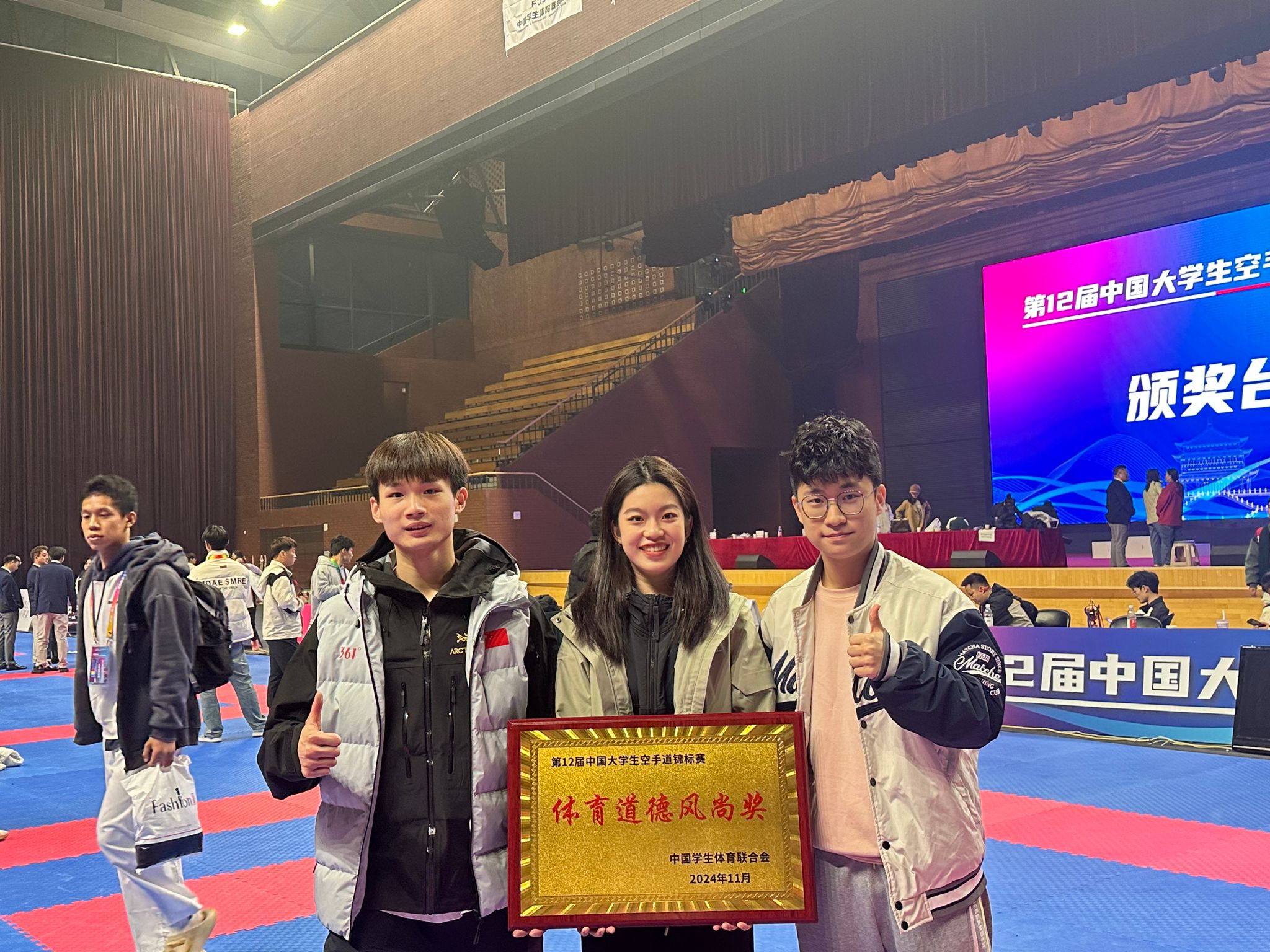本次比赛由3044永利集团江海东老师担任领队,带领空手道队3名运动员参赛。凭借出色的发挥、娴熟的技术和过硬的心理素质,在赛场上沉着冷静、过关斩将,充分彰显了上体空手道健儿的良好精神风貌和精湛技艺。其中,邢辉同学获男子组手丙A组-75公斤级金牌,胡哲远同学获男子甲组个人型金牌,彭宇欣同学获女子丙A组个人型铜牌以及“体育道德风尚奖”运动队荣誉称号。