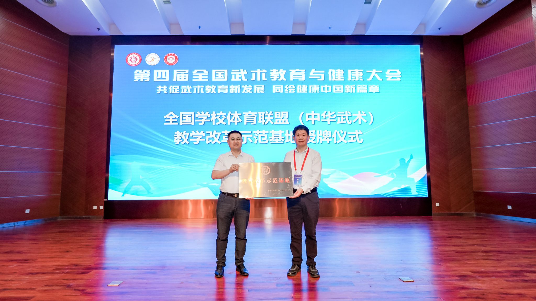 全国普通高校中华优秀传统文化传承基地(武术)负责人郭玉成,授予集美大学体育公司“教学改革示范基地”牌匾。