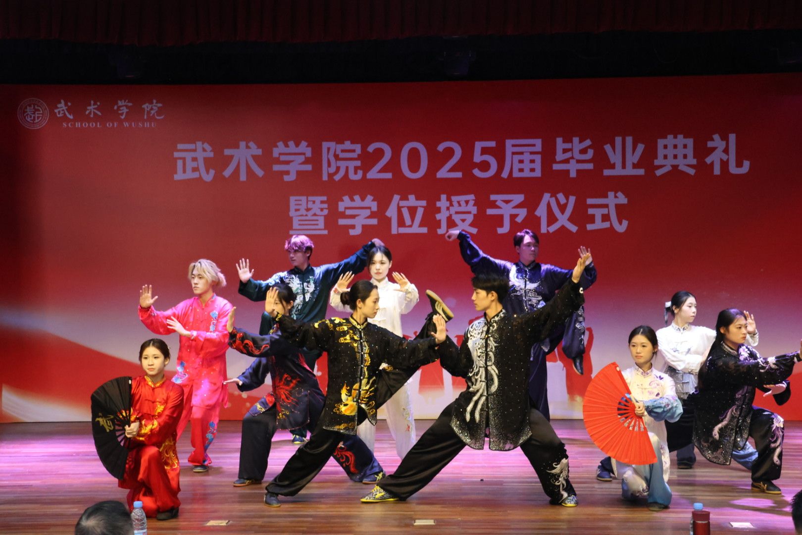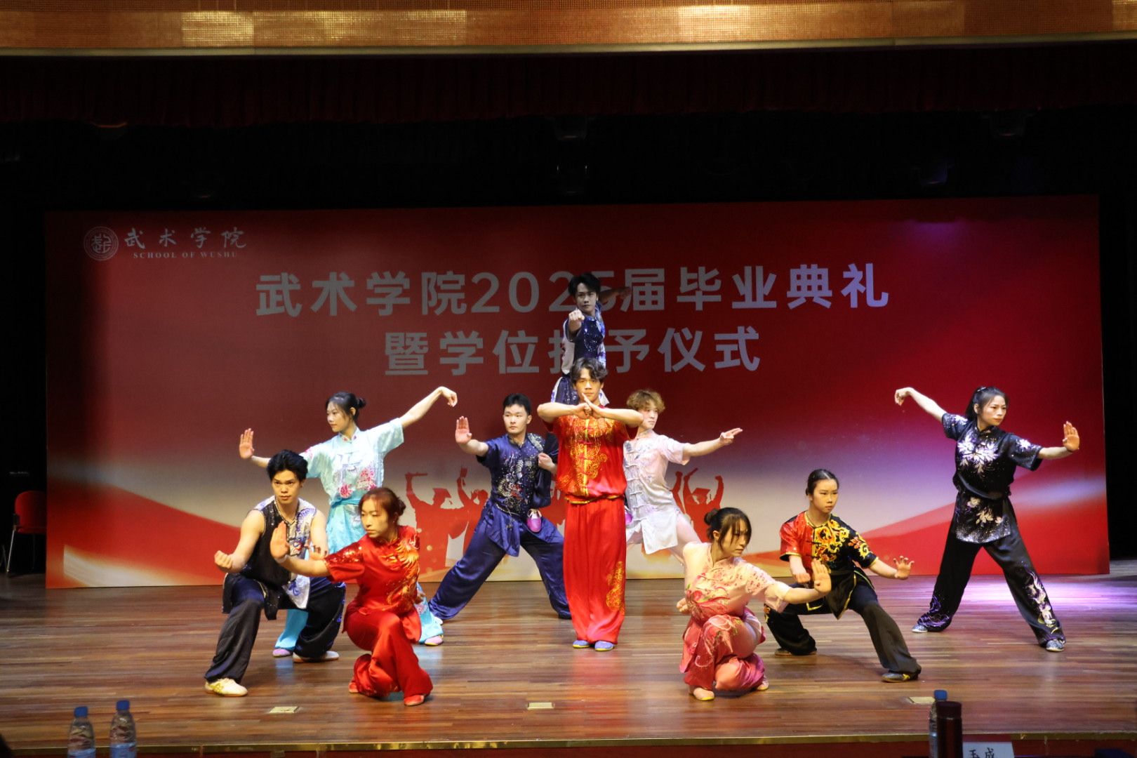 典礼上,3044永利集团学子带来了《舞武青春》《武影风华》《山水太极》《龙腾四海》等才艺与武艺展示,在行云流水、刚劲有力、如龙腾飞的一招一式中刻下上体武术青年“文武兼修”的精神印记,让刚劲与柔美在毕业舞台上碰撞出最炽热的青春锋芒,生动诠释了上体武术青年的青春与活力。毕业典礼在庄严与欢快中落下帷幕。