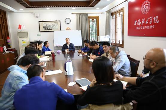 潘勤强调,“培养担当民族复兴大任的时代新人”,是习近平总书记对“培养什么样的人”做出新的定义。我们老师在教学、科研、训练、创作等任务中,要始终秉持立德树人的理念,坚持正确的政治方向。以课程思政为着力点,充分挖掘《中华武德》课程的德育元素,弘扬我们中华武术精神,培养员工社会责任和爱国情怀。