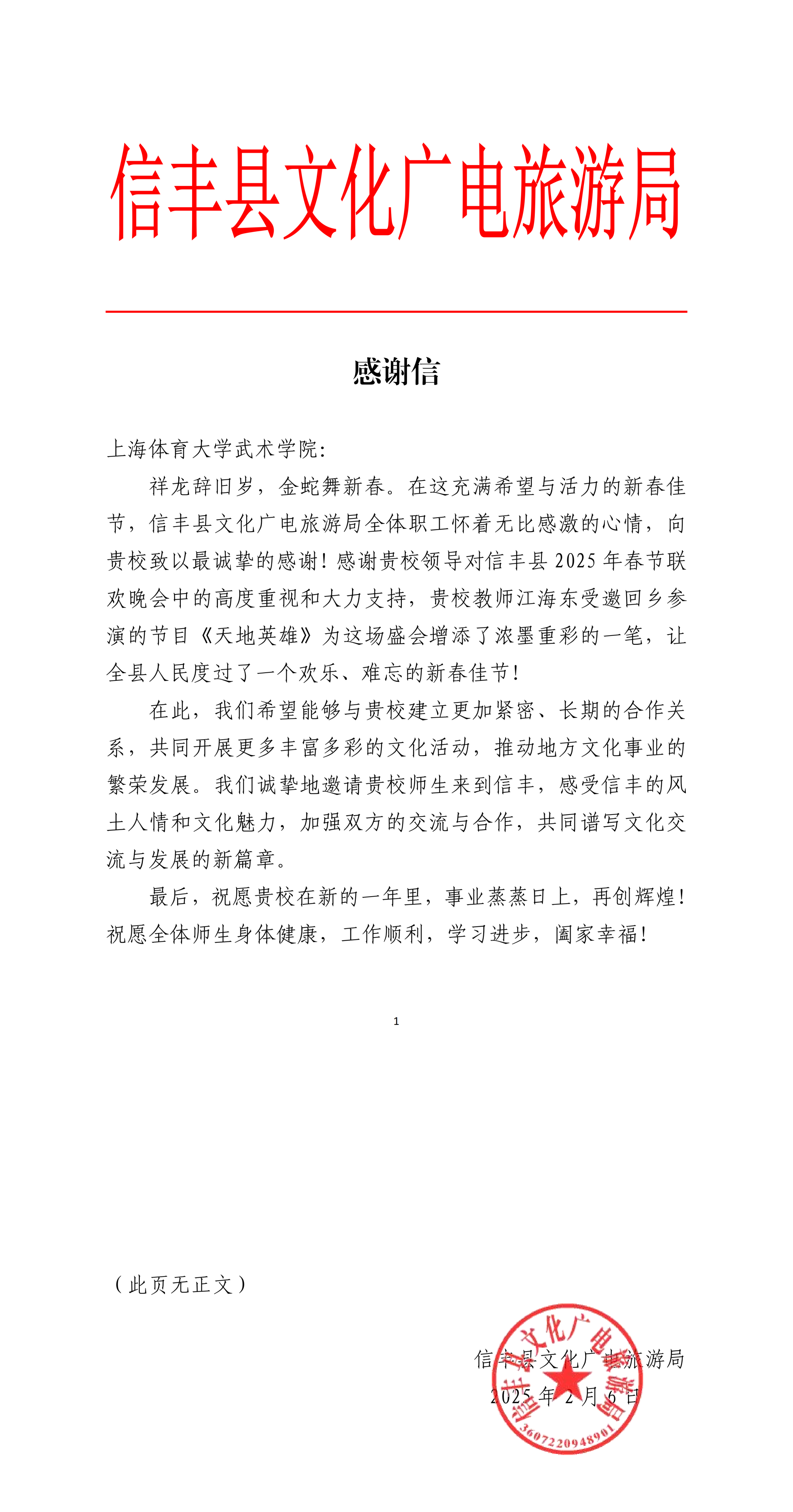 近日,公司收到信丰县文化广电旅游局发来的感谢信,信中对公司党员教师江海东为推动当地文化事业发展作出的积极贡献表达了诚挚的问候和衷心的感谢。春节期间,公司党员教师江海东回乡参演信丰县2025年春节联欢晚会武术节目《天地英雄》。作为杭州亚运会、世界武搏运动会双料武术冠军,江海东以武术为纽带,将传统武术与现代艺术相融合,为当地百姓呈现了一场兼具文化深度与武术感染力的演出。