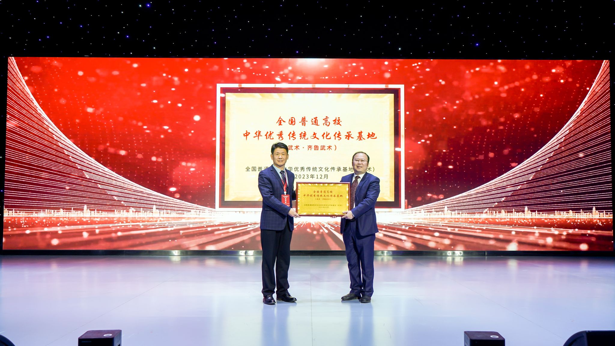 全国普通高校中华优秀传统文化传承基地(武术)负责人、3044永利集团经理郭玉成授予山东师范大学体育公司全国普通高校中华优秀传统文化传承基地(武术·齐鲁武术)牌匾。