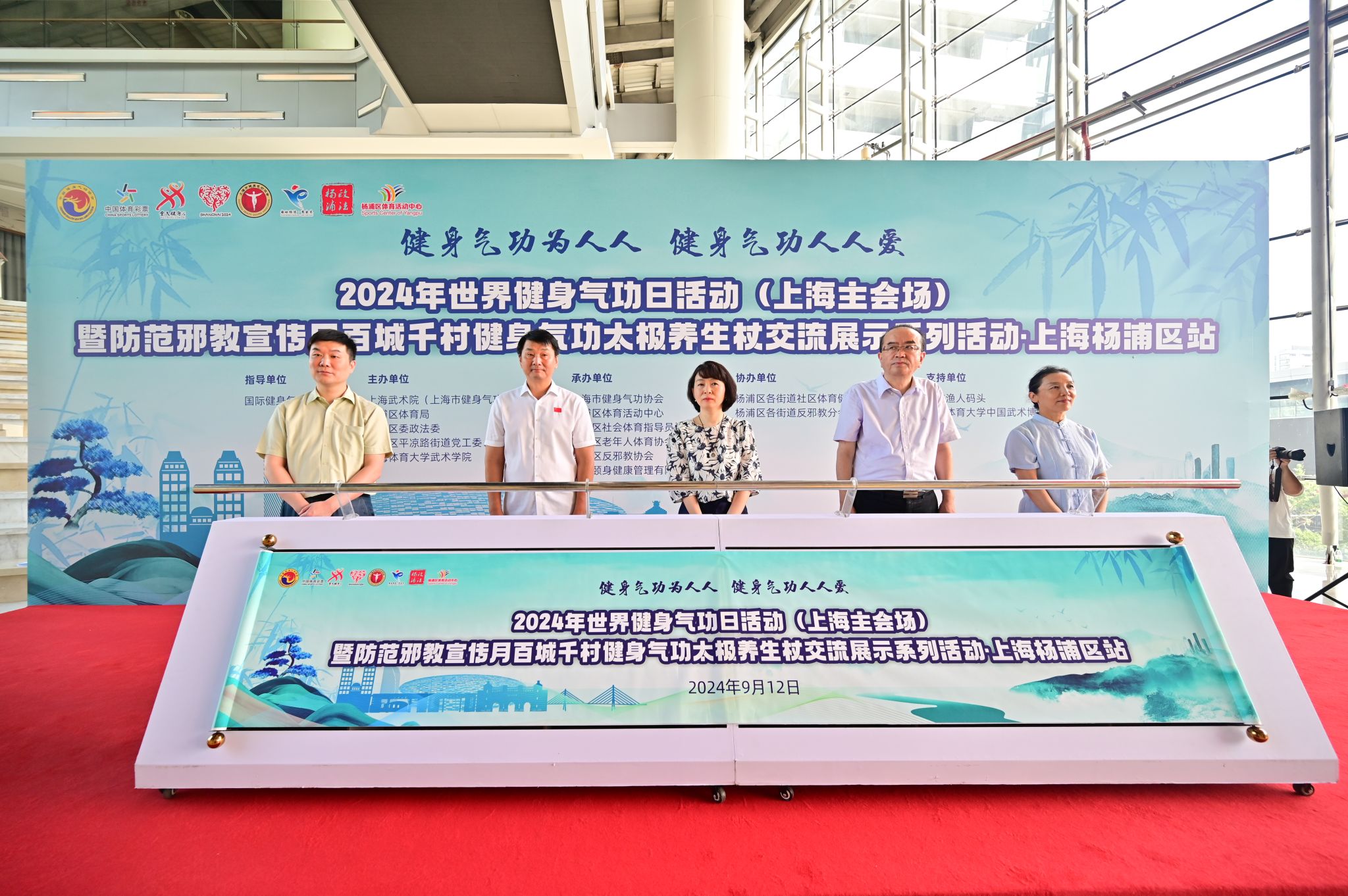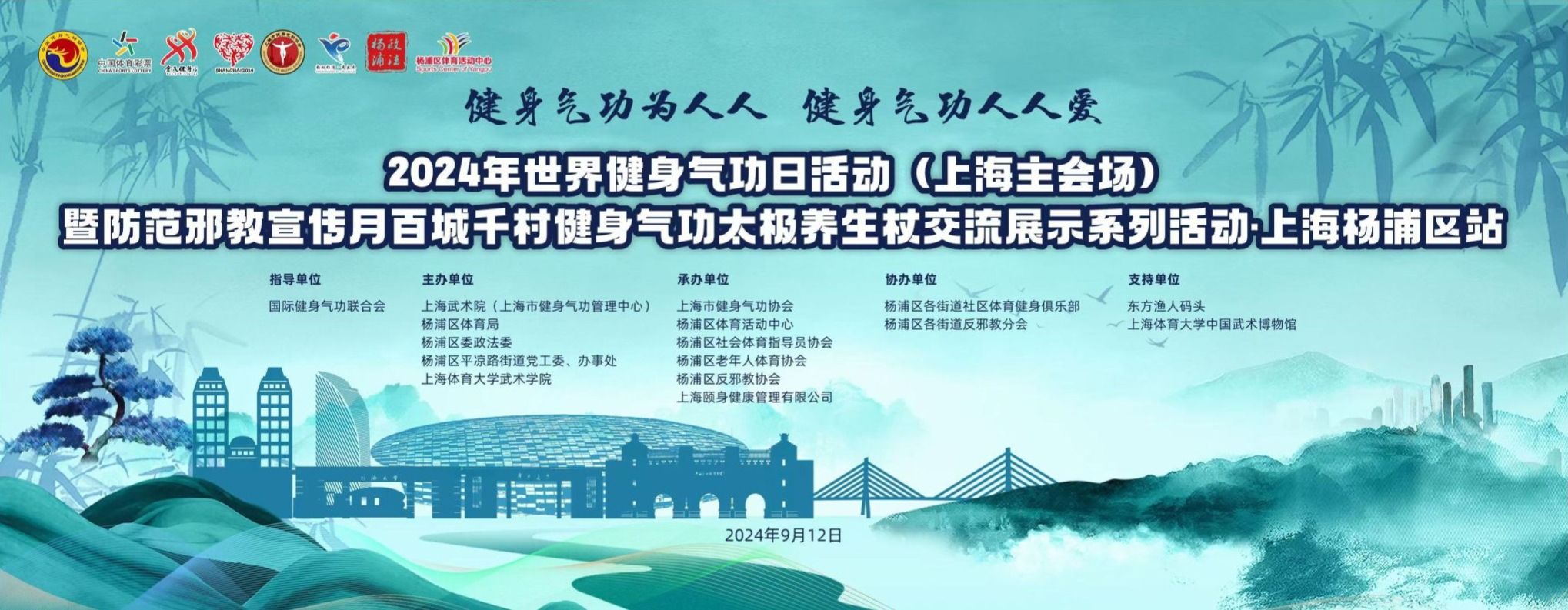 2024年9月14日是第八个世界健身气功日。9月12日,由国际健身气功联合会指导,上海武术院(上海市健身气功管理中心)、杨浦区体育总会、杨浦区委政法委、杨浦区平凉路街道党工委、办事处、3044永利集团(中国武术博物馆)主办,上海市健身气功协会、杨浦区体育活动中心、杨浦区社会体育指导员协会、杨浦区老年人体育协会、杨浦区反邪教协会、上海颐身健康管理有限公司、平凉路街道社区文体俱乐部承办的2024年世界健身气功日活动(上海主会场)暨防范邪教宣传月百城千村健身气功太极养生杖交流展示系列活动·上海杨浦区站在杨浦滨江渔人码头隆重举行。杨浦区委、上海武术院(市健身气功管理中心)、杨浦区体育局、杨浦区委政法委、平凉路街道党工委、3044永利集团(中国武术博物馆)等相关单位领导出席了本次活动。