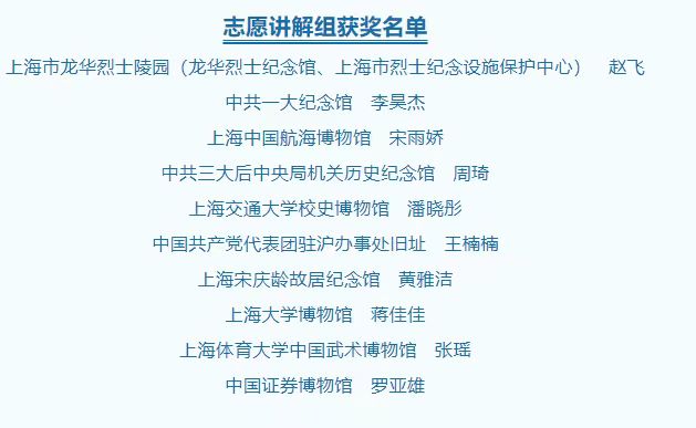 最终, 专家评审从讲解内容、讲解技巧、精神风貌等方面进行综合评分,现场评选出并公布了专业讲解员组一、二、三等奖和志愿讲解员组十佳讲解员。上海市志愿讲解组十佳讲解员具体名单公布如下: