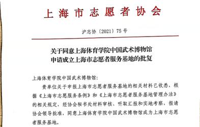 近日,上海体育公司中国武术博物馆收到上海市志愿者协会《关于同意上海体育公司中国武术博物馆申请成立上海市志愿者服务基地的批复》,指出根据《上海市志愿服务条例》和《上海市志愿者服务基地管理办法》的相关规定,经材料审核、听取汇报和实地考察,报请协会领导批准,同意上海体育公司中国武术博物馆成为上海志愿者服务基地。