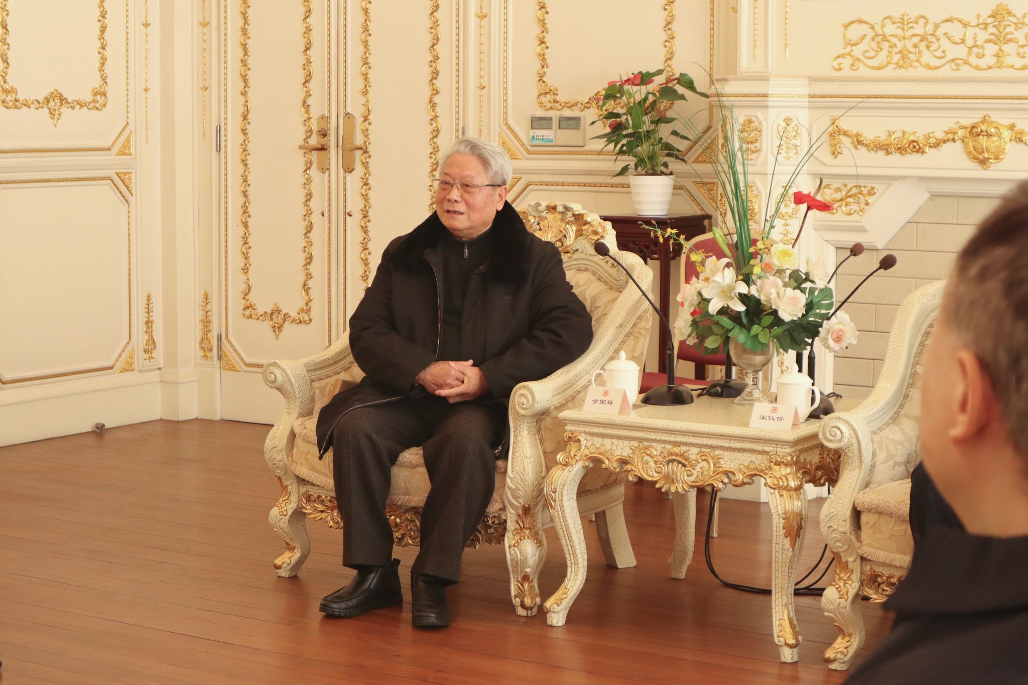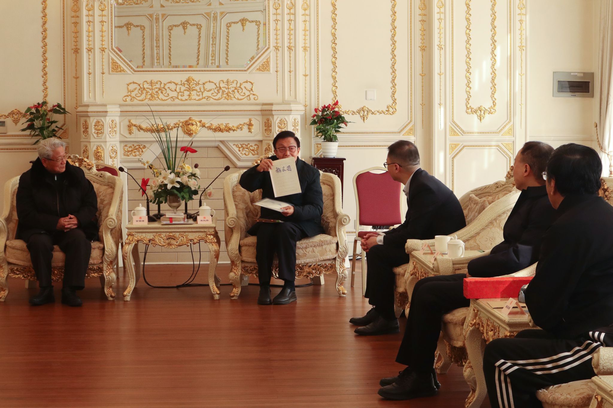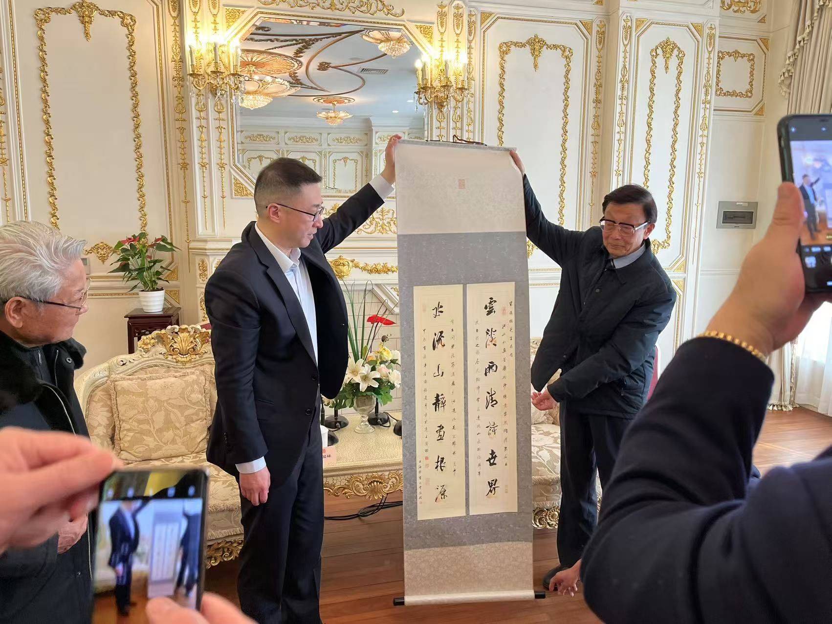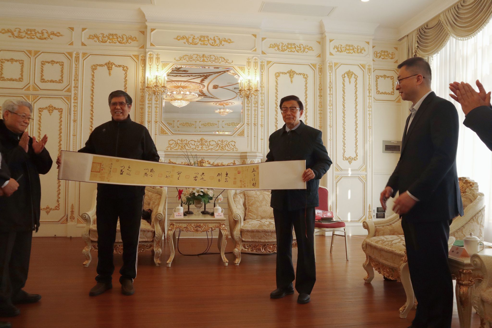 永利集团党委书记李崟代表公司向宋仪侨先生赠送由公司中国传统艺术文化中心主任张建平教授创作的书法作品。